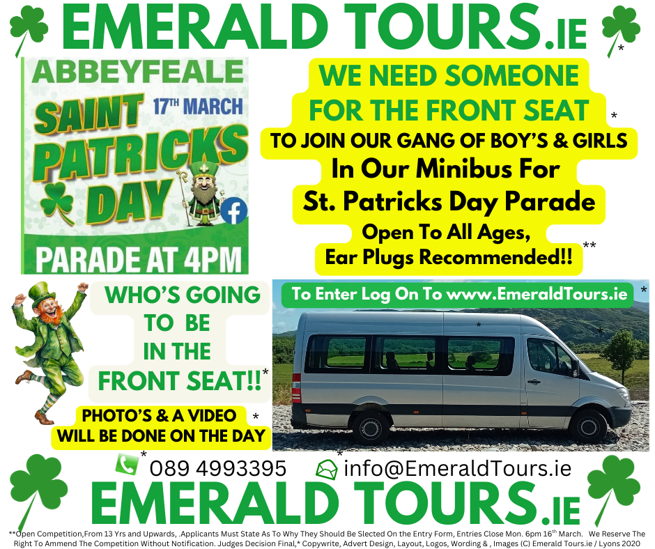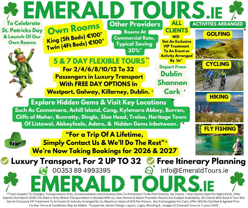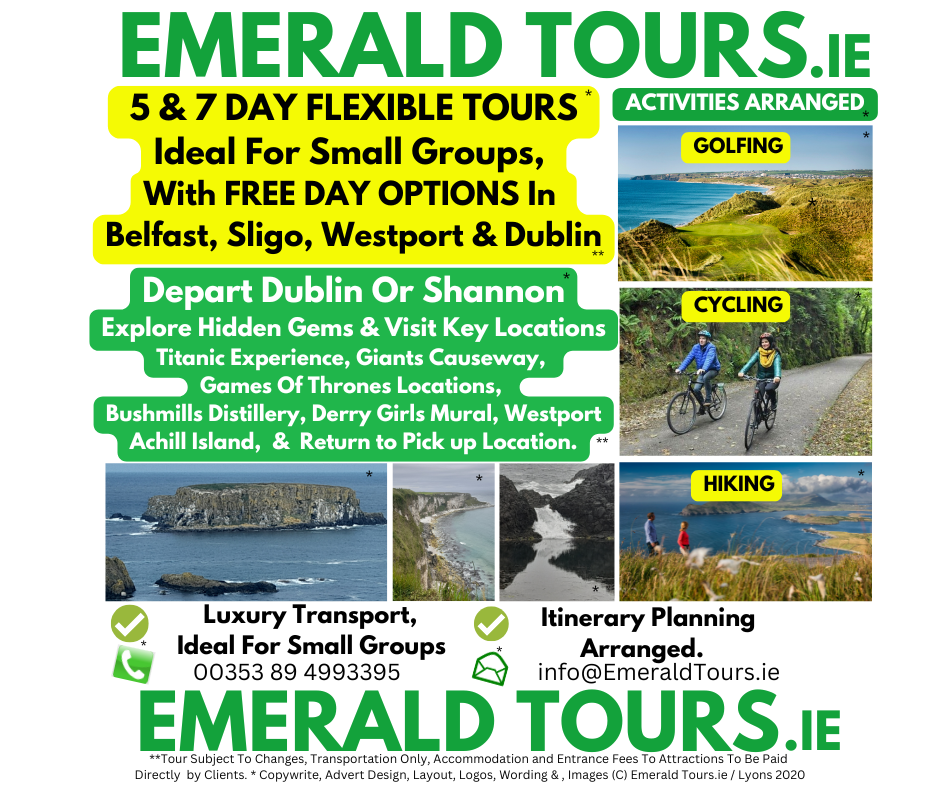 With Free Day Or 1/2 Day Options in, Galway, Killarney, Westport, Belfast.